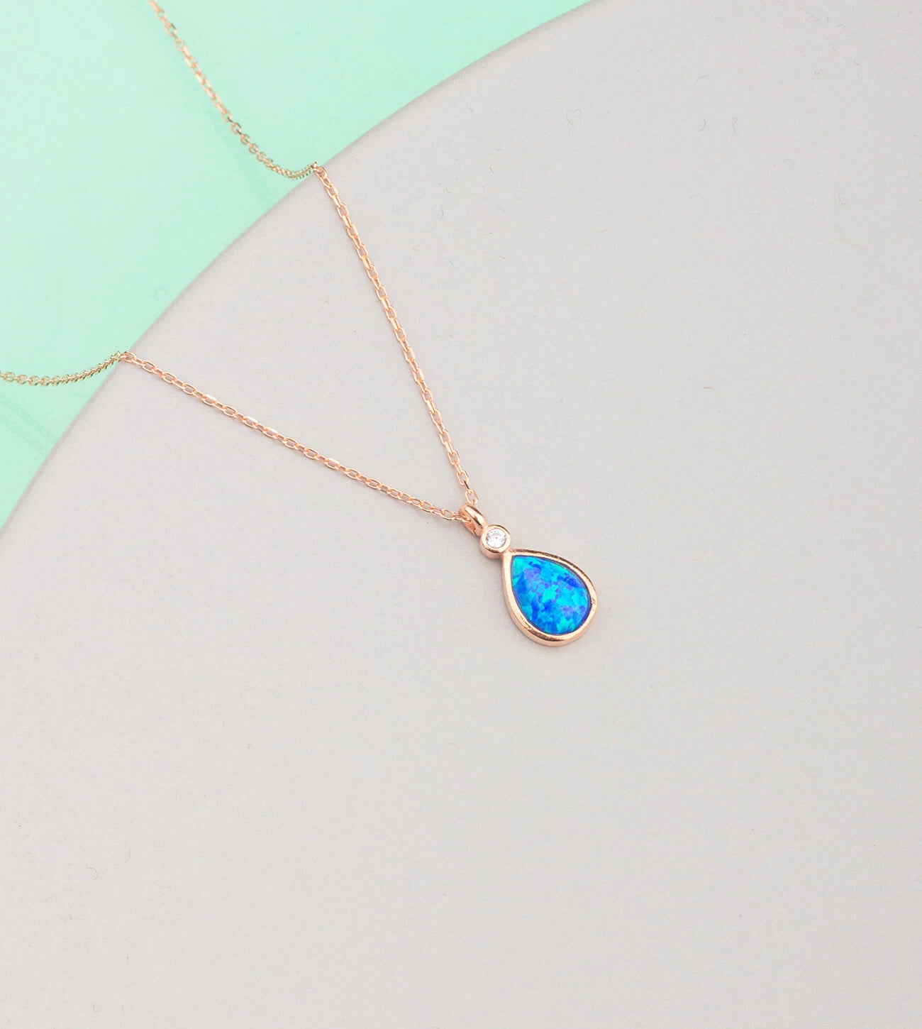 Eine elegante Tropfen-Halskette mit Opal-Stein, gefertigt aus hochwertigem 925er Sterlingsilber und veredelt mit rosévergoldetem Überzug. Ein stilvolles Schmuckstück – perfekt als Geschenk für besondere Anlässe.